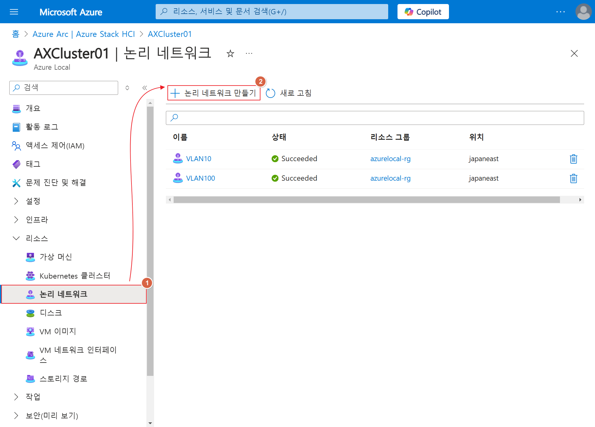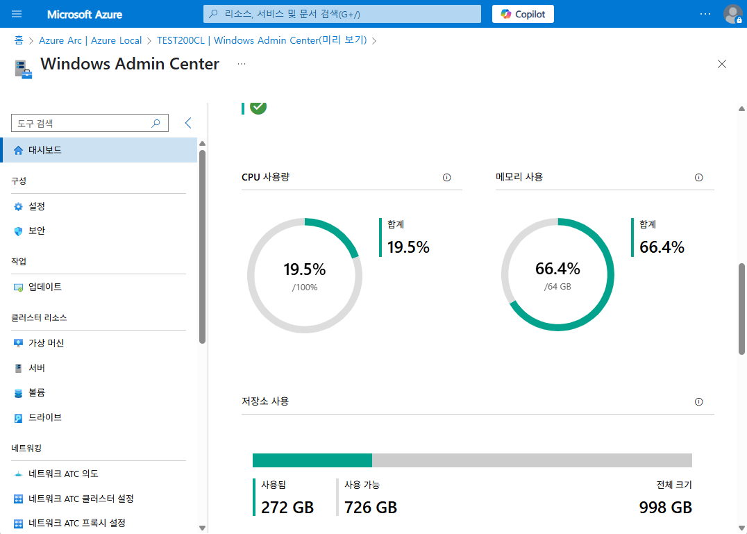 Azure Portal 에서 제공하는 WAC(Windows Admin Center) 기능을 통해 별도의 WAC를 On-Premises에 설치하지 않고 도 Azure Local(Azure Stack HCI) Cluster를 관리할 수 있습니다.카테고리기능 항목서버 관리디바이스 설치된 앱, 로컬 사용자 및 그룹, 역할 및 기능,작업 스케줄링, 원격 데스크톱스토리지 및 디스크볼륨, 드라이브, 스토리지, 파일 및 파일 공유네트워크 및 가상화가상 머신, 가상 스위치, SDN 인프라보안 및 시스템방화벽, 인증서, 보안, 진단, 이벤트, 레지스트리, 프로세스성능 모니터링 1. Azure Portal > Azure Arc | Azure Local > Cluster > 설정 > Windows Admin Center